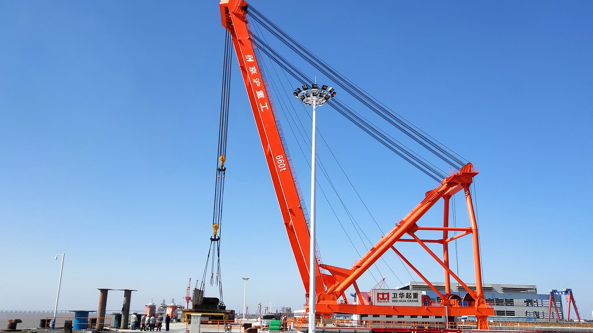 该起重机用于京沪重工码头,主要承担码头吊运22000m³LPG液罐。两吊钩抬吊起重量可达660吨,变幅幅度21.5-54m。